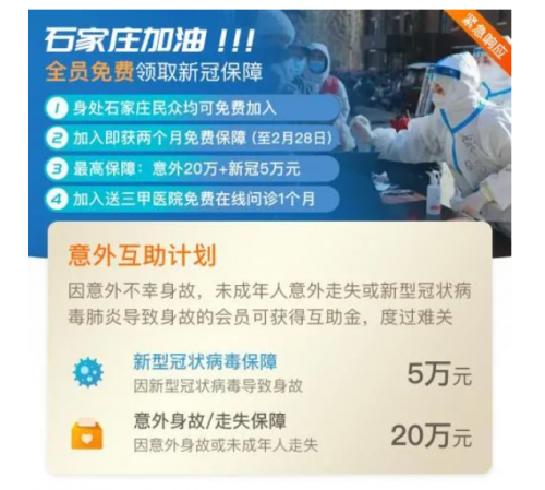 回顾2020年新冠病毒肆虐之时,e互助率先将“新冠肺炎”列入意外互助范围,成为行业内首个启动“新冠肺炎”专项互助的平台,为全国人民群众的安全和健康贡献了一份力量。临近2021年春节,e互助意外互助计划全力无偿支援石家庄抗击新冠肺炎,所有石家庄市民都可获得一份新冠肺炎保障,并免除两个月分摊费用,最高保障意外20万元和新冠5万元。