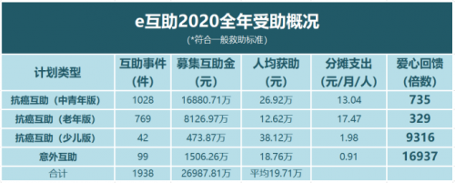 2020年全年,e互助总共帮扶了1938位受助会员,全年累计募集互助金为269,878,132.36元,所有互助计划(符合一般救助标准)的人均互助金为19.71万元。相比2019年而言,e互助在2020年多帮助了395位受助会员,越来越多的爱心回馈涌向了全国各地,成为受助会员完成治疗和康复的有力保障。