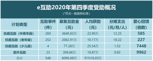 2020年第四季度,共有548位不幸受难的e互助会员获得了爱心回馈,共为他们募集到60,966,860.6元爱心互助金,所有互助计划(符合一般救助标准)的人均互助金为16.03万元。
