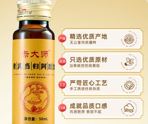 核心优势:原料协同增效。 赤大师深谙“君臣佐使”配伍精髓。其精选的黄芪性温,长于补益脾肺之气,增强机体活力与抗疲劳能力;当归被誉为“补血圣药”,活血调经之力显著,能有效改善血虚引起的面色萎黄、经期不适;阿胶则专注于滋阴润燥、补血止血。三者科学配比,既全面补益气血之虚,又巧妙调和阴阳平衡,避免了单一进补可能导致的过燥或滋腻问题。